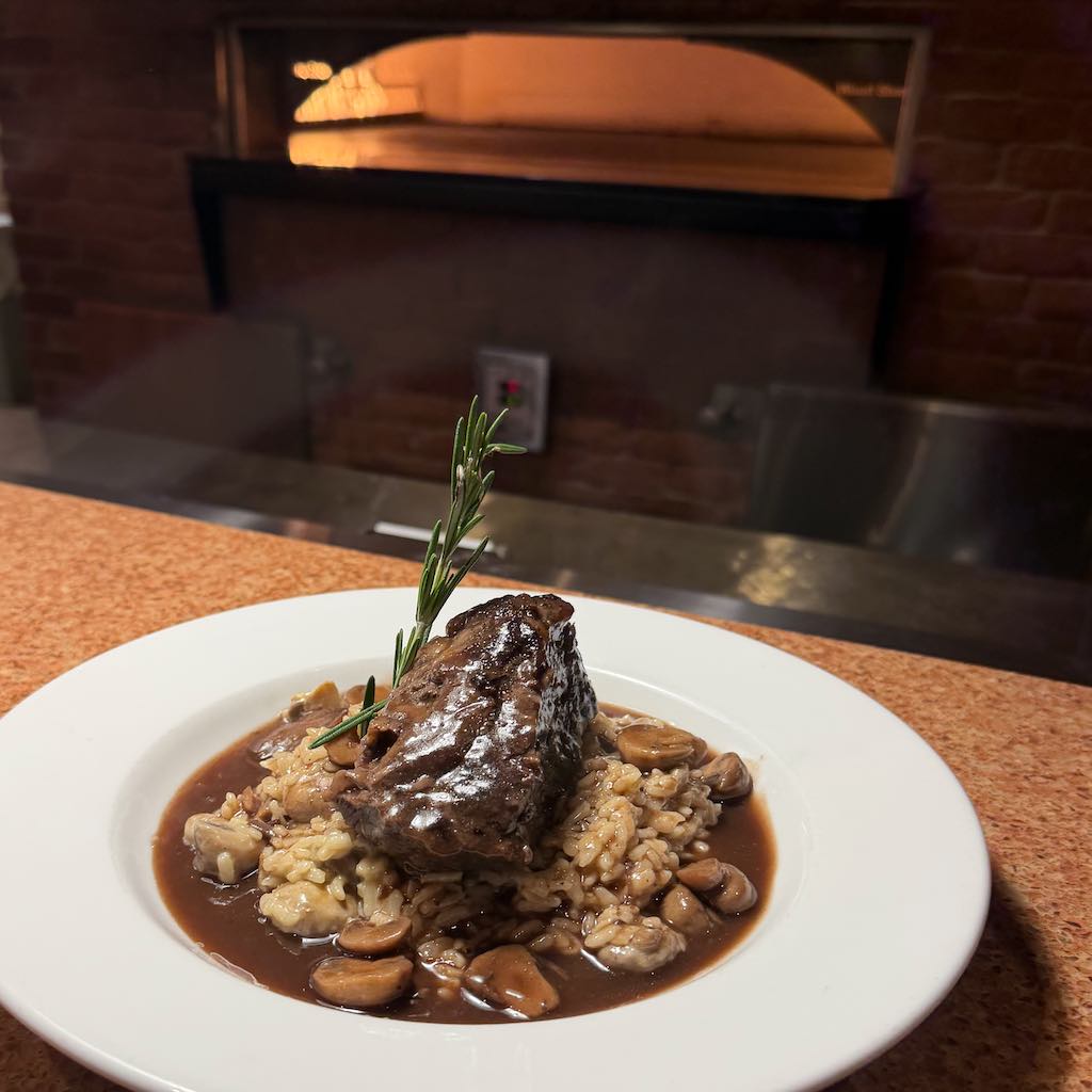 Braised boneless short rib served over a creamy Parmesan mushroom and onion risotto, topped with a red wine beef demi glaze.