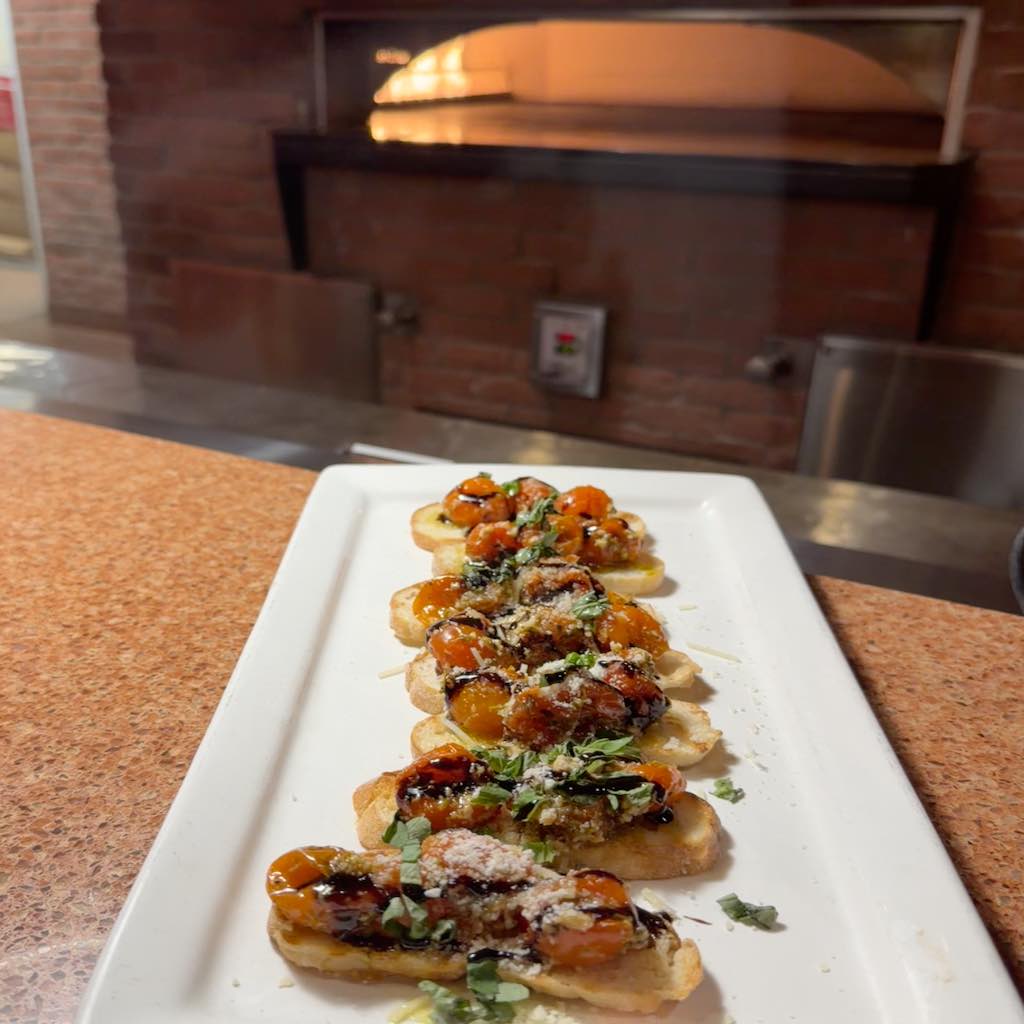 Toasted crostini bread topped with roasted cherry tomatoes topped with Parmesan cheese, extra virgin olive oil and balsamic glaze.