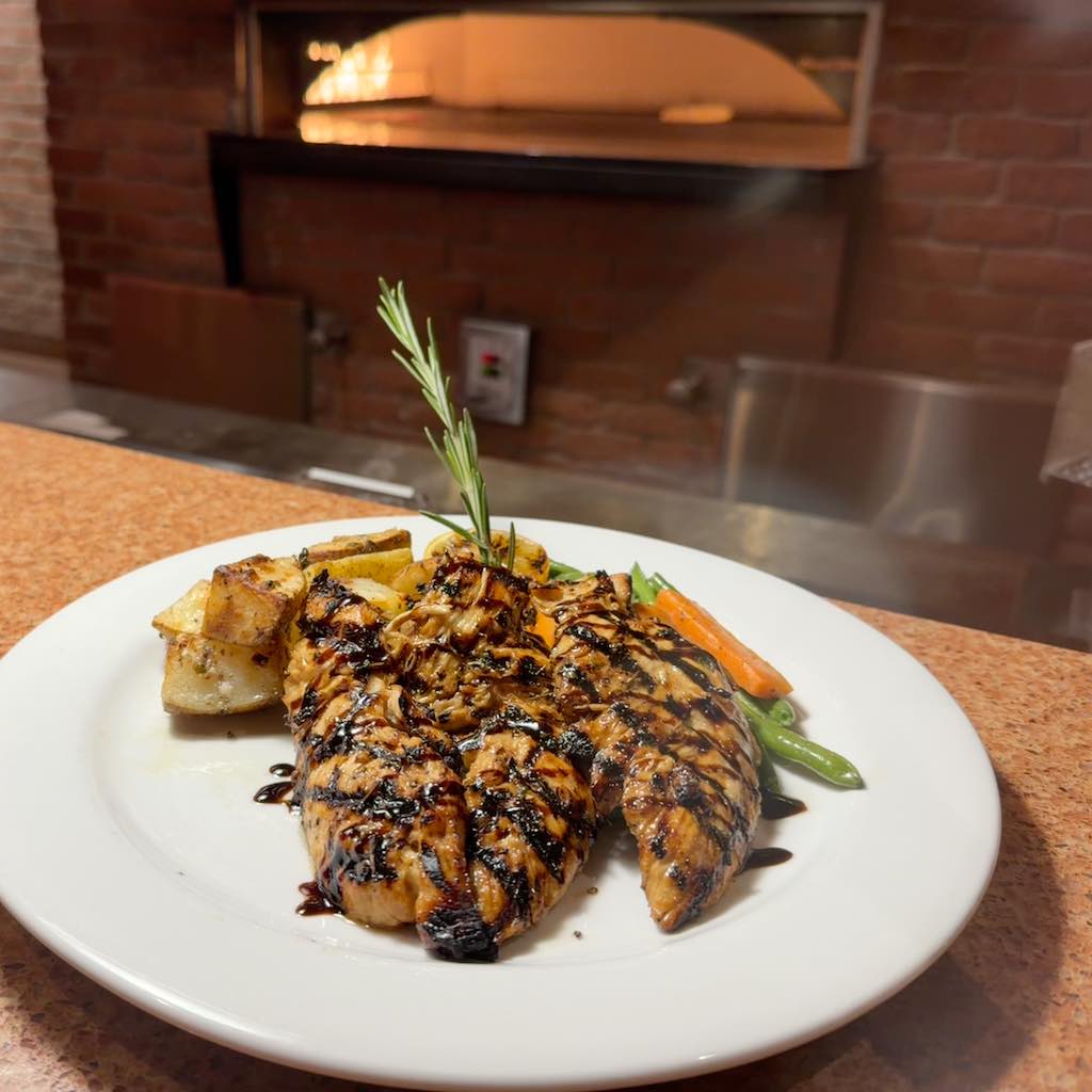 Grilled chicken breast marinated in our home made balsamic vinaigrette. Served with seasonal vegetables and potato wedges.