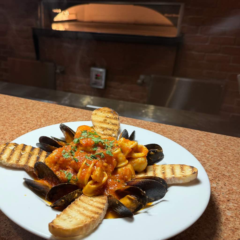 Cod, shrimp, scallops, calamari, and mussels in a delicious and savory tomato seafood broth. Served with crostini bread.