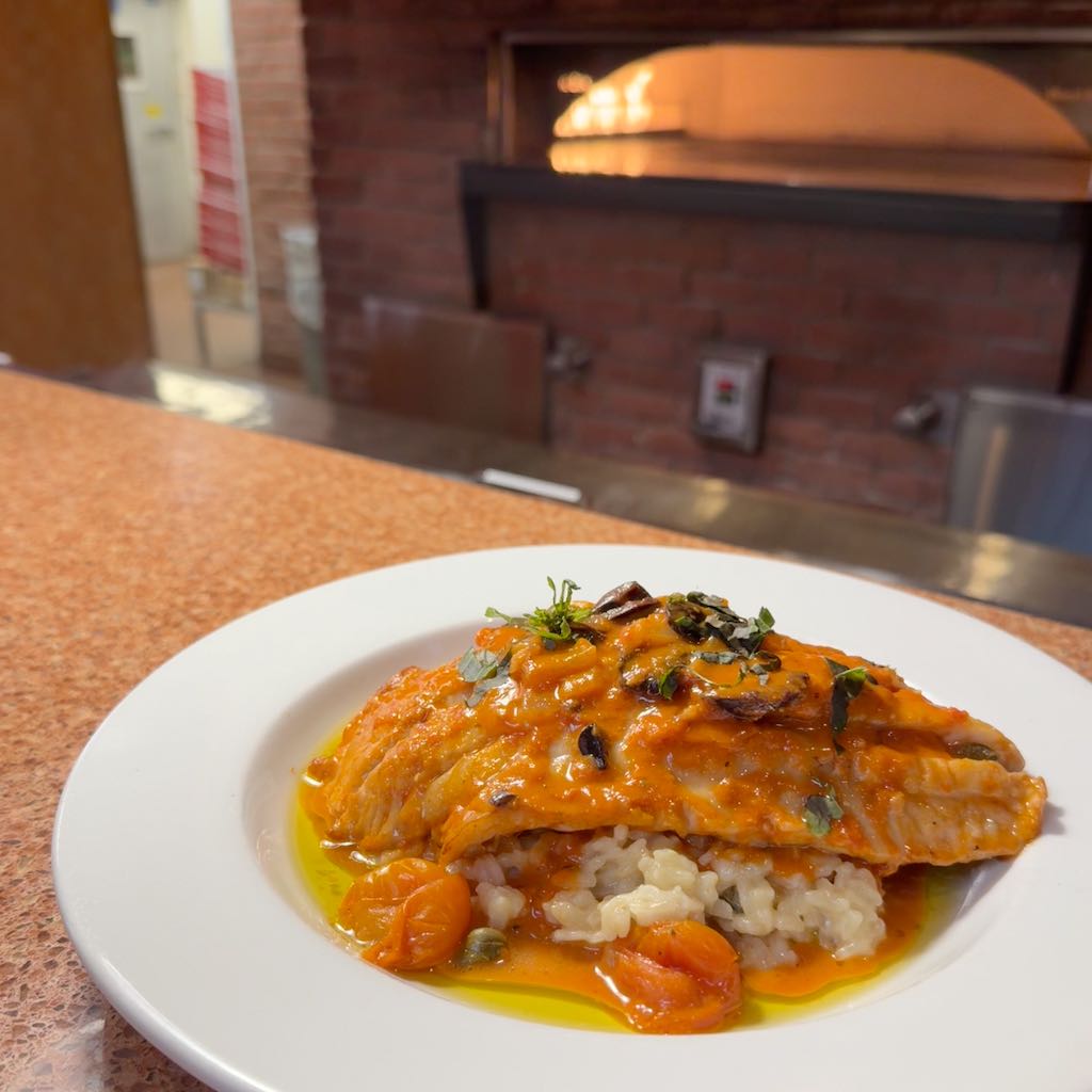 Seared Grouper, White Wine Tomato Sauce, Basil Onion Risotto, Onions, Capers, Kalamata Olives and Roasted Cherry Tomatoes.