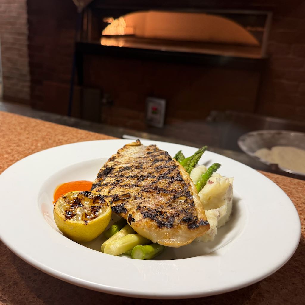 10 oz. grilled pork rib eye grilled to perfection finished with an Italian herb butter, seasonal vegetables and served with Marsala Beef Demi Glaze and mashed potatoes.