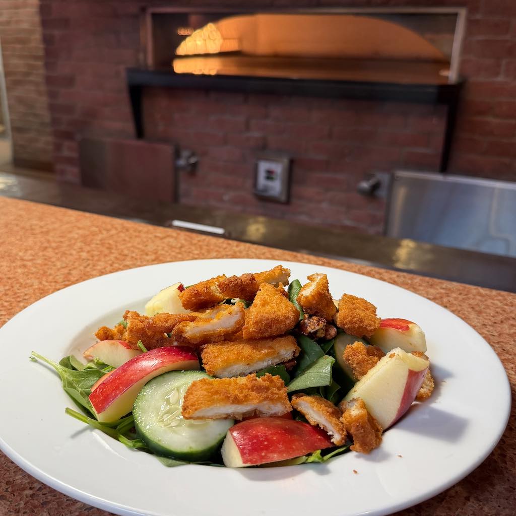 Baby spinach, tomatoes, cucumbers, crispy chicken, apple slices, glazed pecans & crumbled bleu cheese. Choice of dressing.