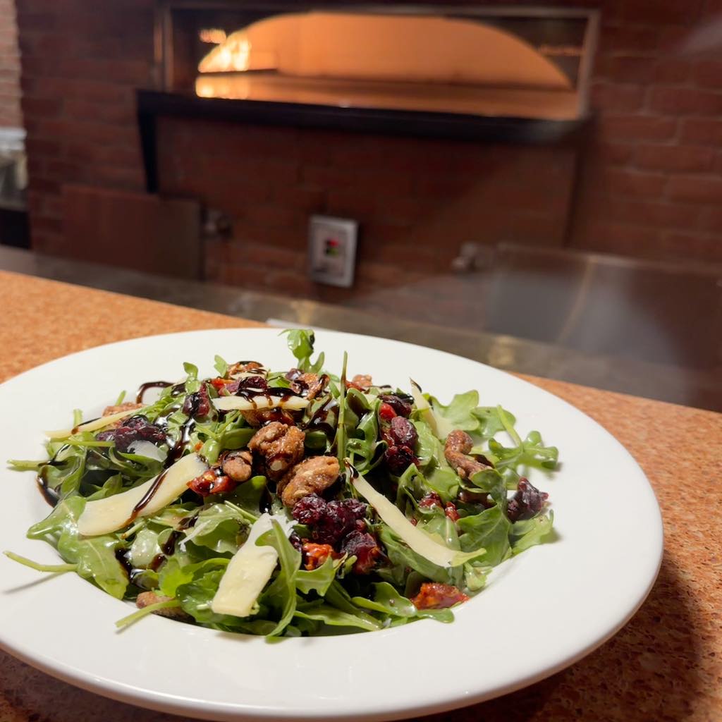 Honey Balsamic Vinegrette, Sun Dried Tomatoes, Shaved Parmensan, Caramelized Pecans, Dried Cranberries and Arugula Salad.