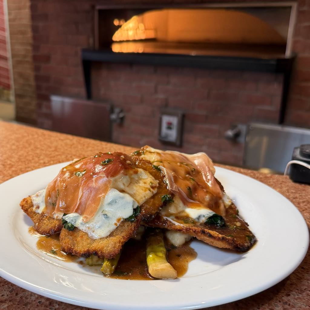 Tender veal hand breaded topped with spinach, provolone cheese, and prosciutto Di Parma in a marsala wine sauce. Served with mashed potatoes and fresh asparagus.
