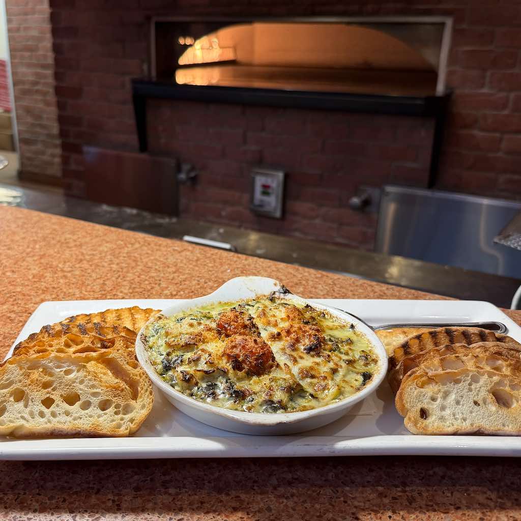 Baby spinach and artichoke hearts in a blend of herbs and italian cheeses topped with diced Roma tomatoes, served with toasted bread.