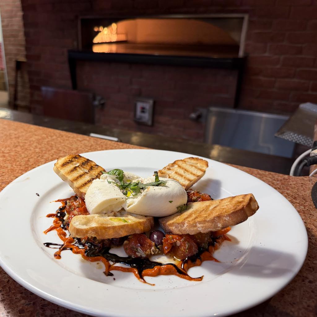 Fresh Burrata cheese served with roasted cherry tomatoes, Kalamata olives and crostini bread. Garnished with basil aioli, balsamic glaze, and roasted pepper purée.