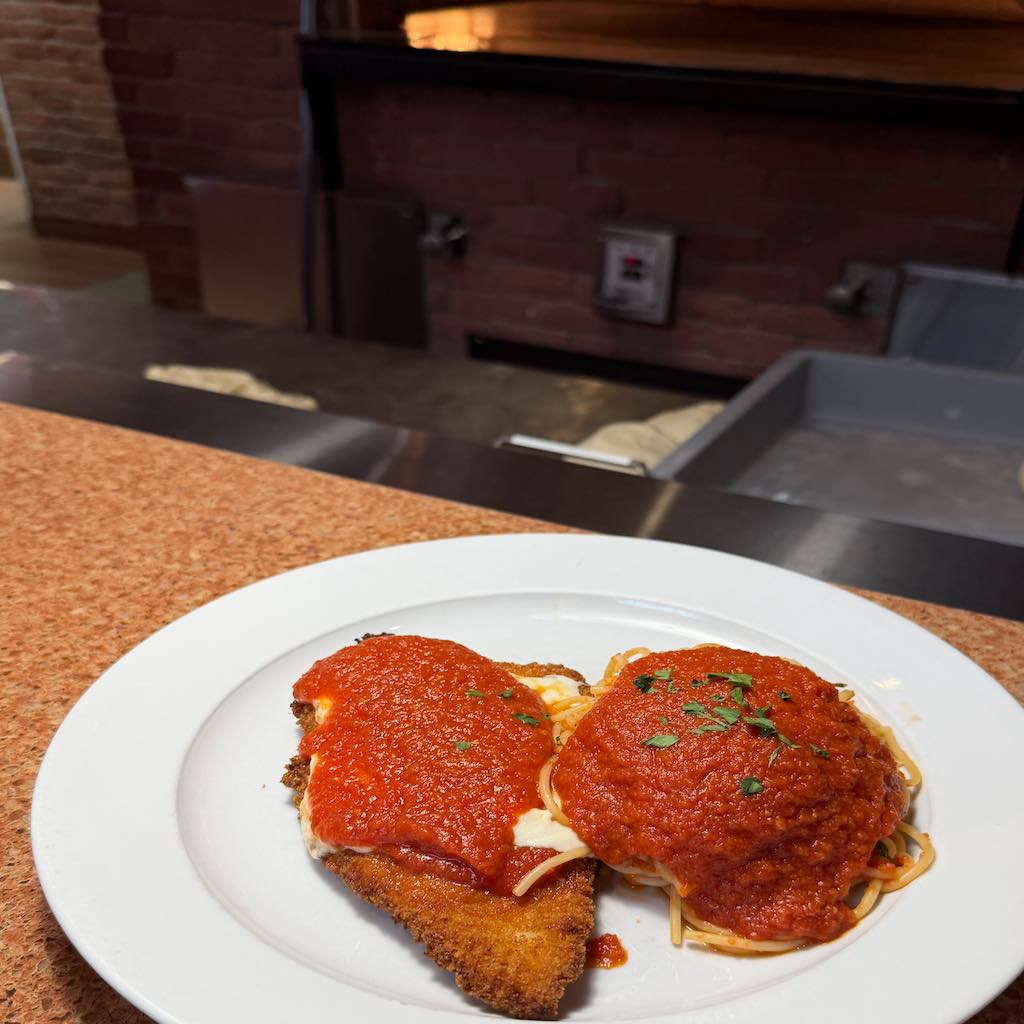 Hand breaded chicken breast lightly fried, topped with a mozzarella and marinara sauce. Served with spaghetti pasta.