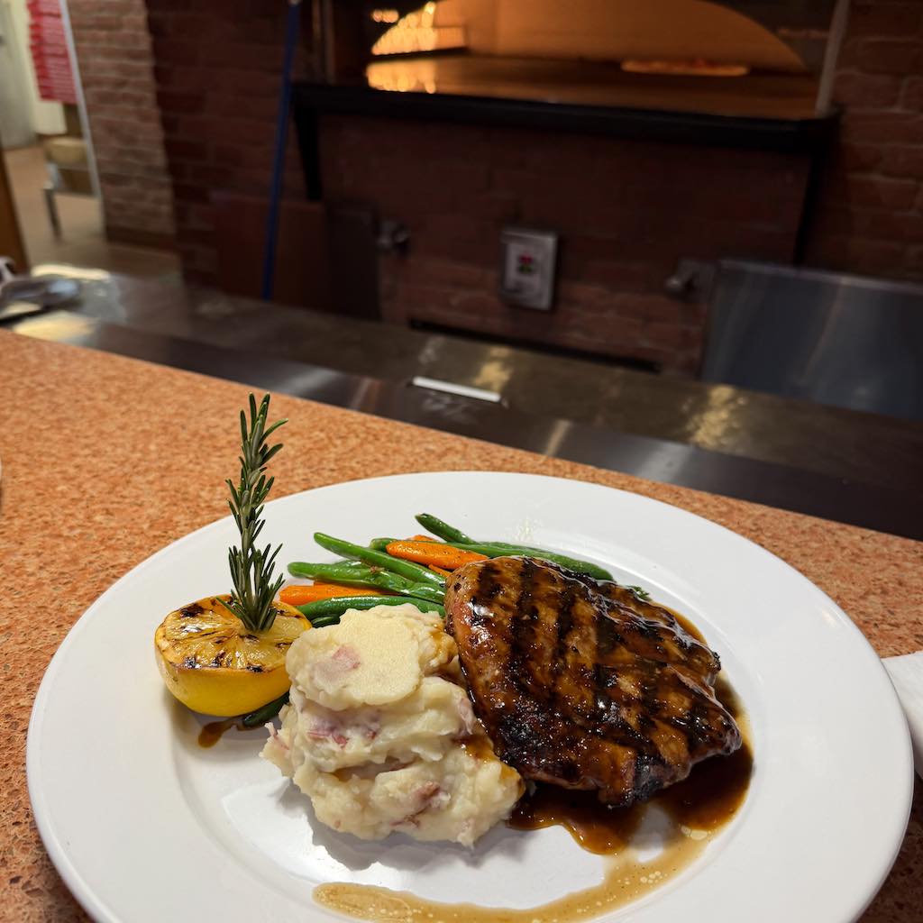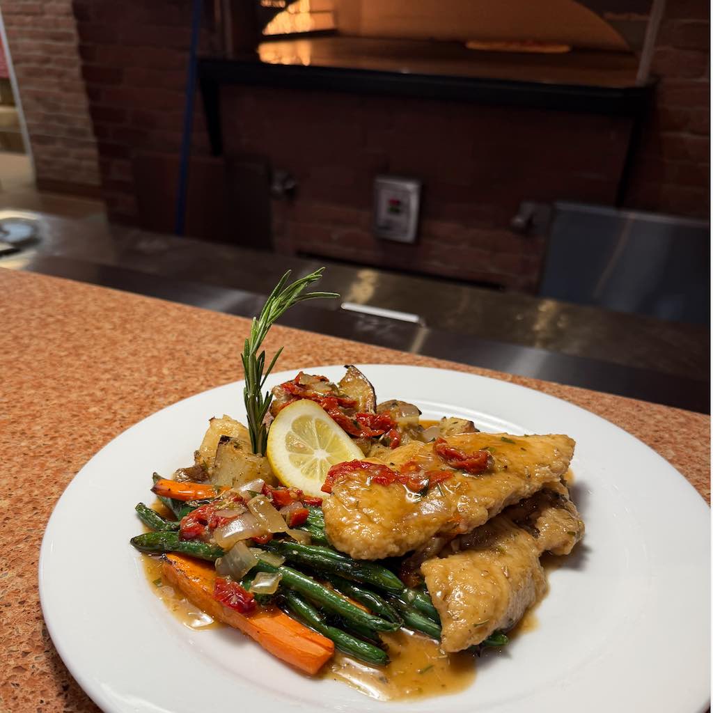 Chicken, Caramelized Onion, Sun Dried Tomatoes, Lemon Rosemary White Wine Sauce and Seasonal Veggies.