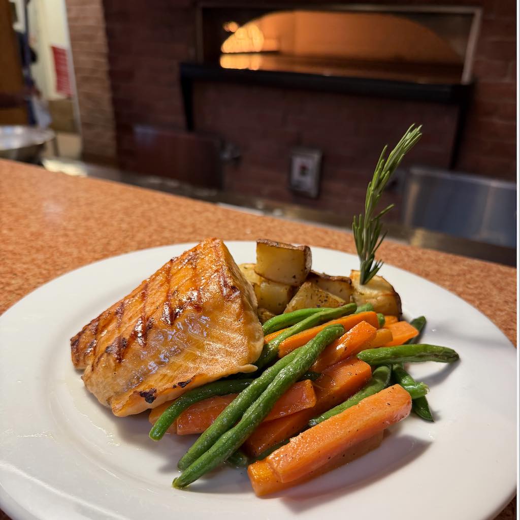 Honey glazed Atlantic salmon served with oven roasted potato wedges and seasonal vegetables.
